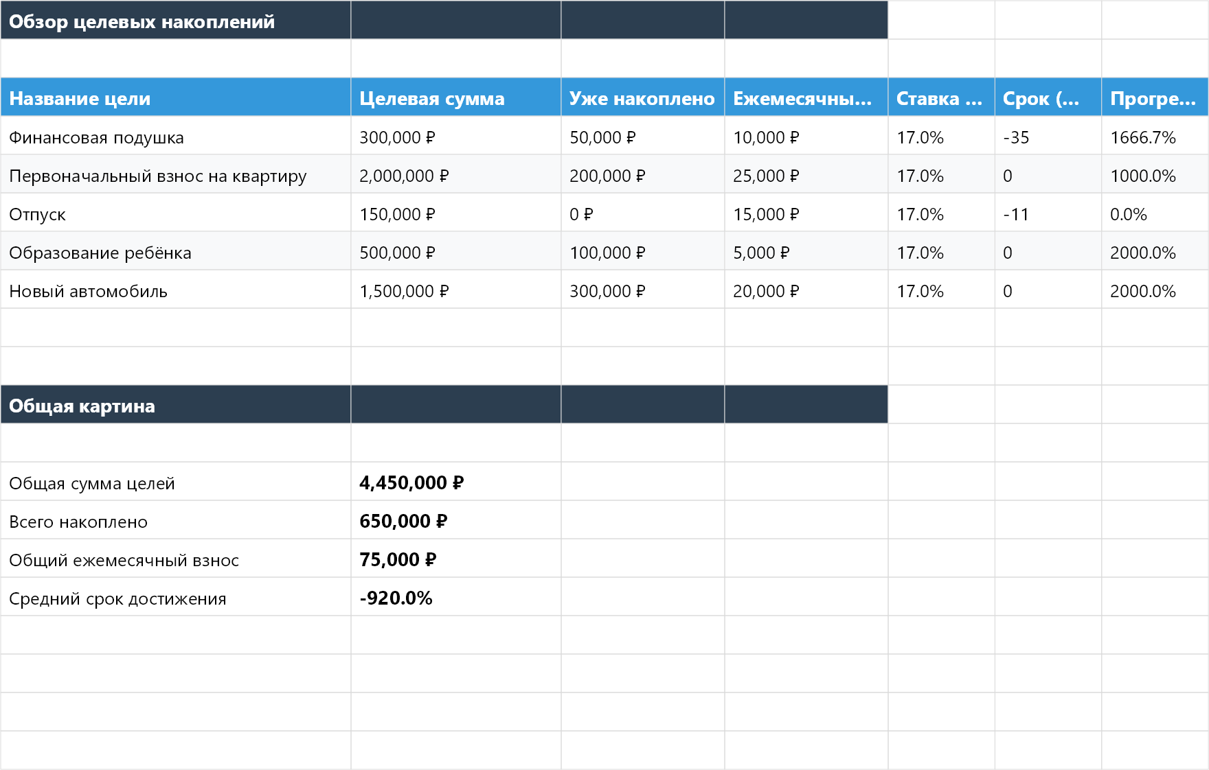 - Лист «Цели» — обзор до 5 целей: целевая сумма, прогресс, ежемесячный взнос, расчётный срок (КПЕР/NPER)