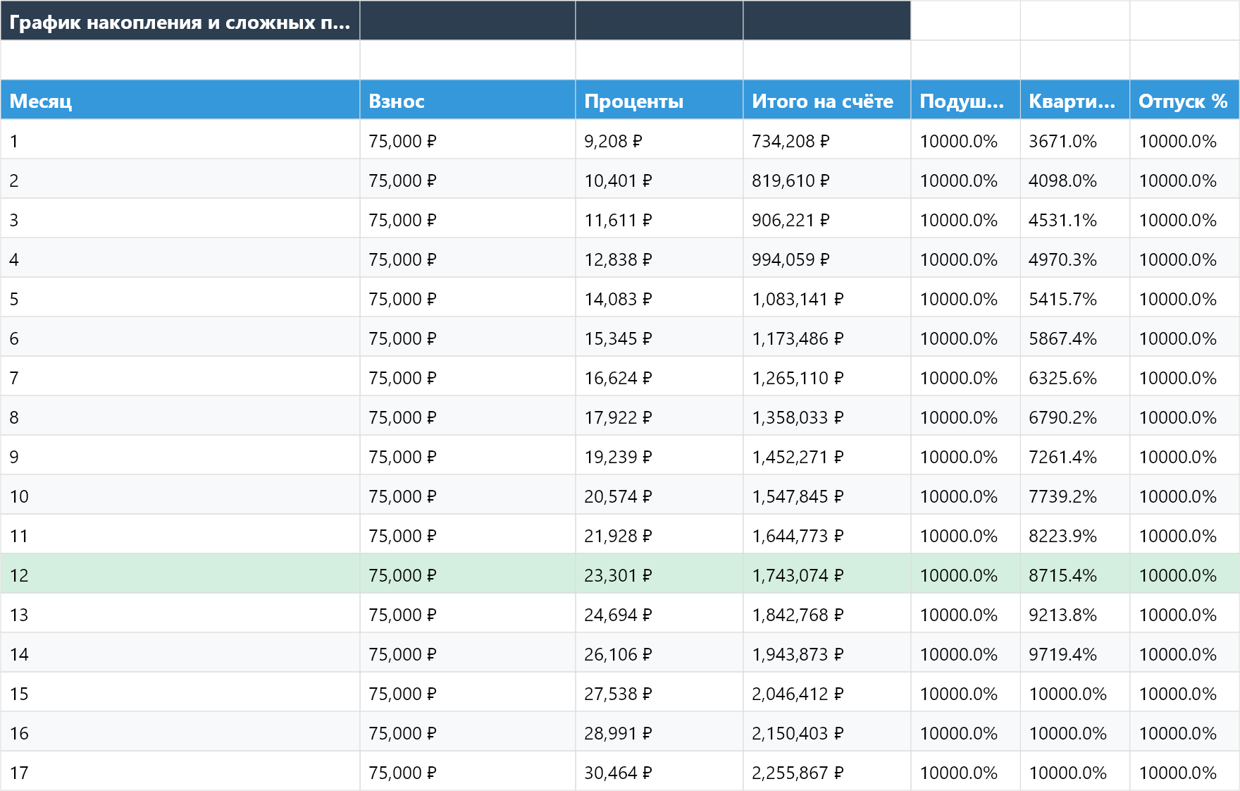 - На листе «График накоплений» — смотрите, как растёт портфель по месяцам