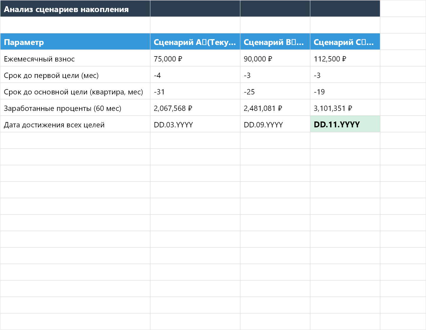 - На листе «Сценарии» — сравните, как ускорение взносов влияет на сроки