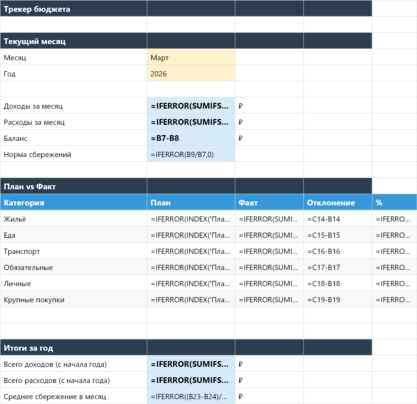 - Лист «Дашборд» — сводка за месяц: доходы, расходы, баланс, план vs факт по 6 категориям, итоги за год