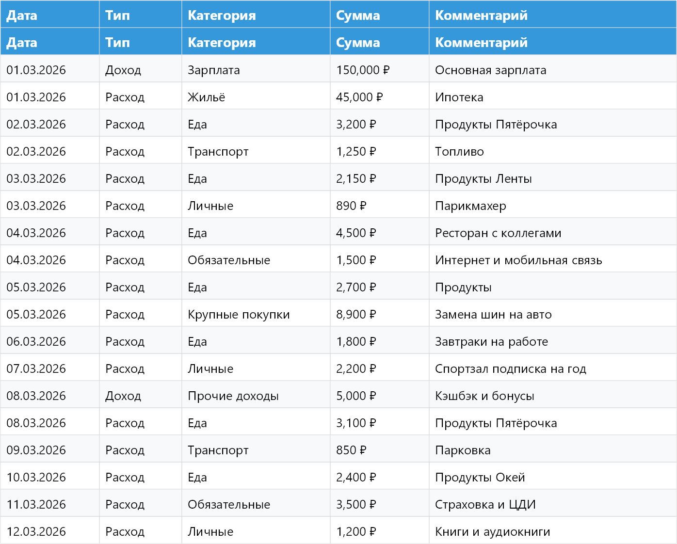 - Лист «Аналитика» — расходы по категориям помесячно, тренд доходов/расходов, нарастающий баланс, топ-5 расходов